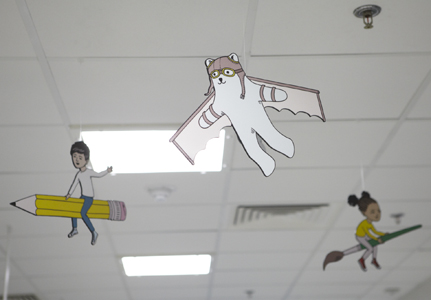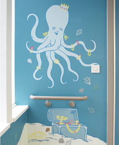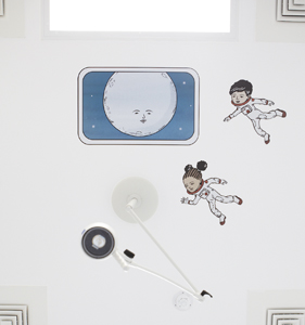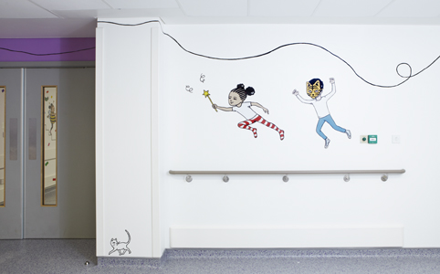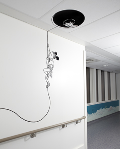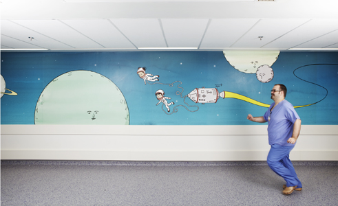 A Journey Around my Pencil Case is a mixed media installation transporting children from the wards, and taking them on a surprising and entertaining journey to the operating theatre. The route incorporates hand-painted elements, sculpture and vibrant wallpapers. Follow the line drawn along the route as it climbs up into the ceiling, then dive deep underwater to discover glimmering jewels. A confetti welcome awaits patients the end of the journey; a celebratory carnival before a triumphant launch up to space.